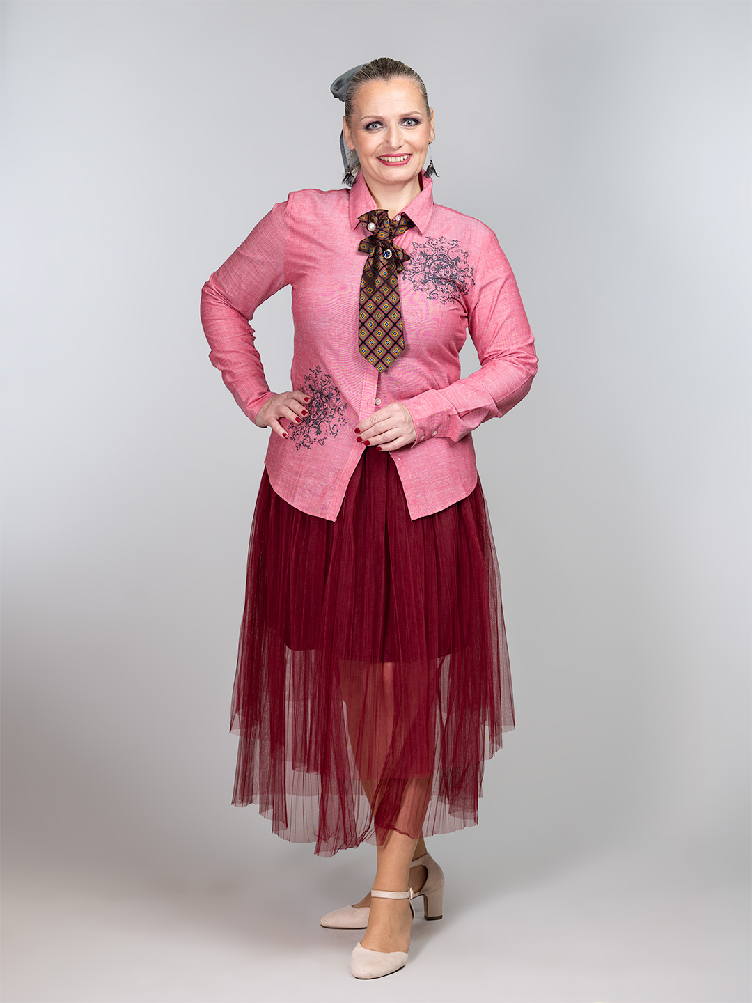 Ova bordo suknja redefinira ženstvenost kroz prozirne slojeve i teksturu koja poziva na igru. Duboka, bogata boja i lepršavi til čine je komadom koji podiže puls svakom outfitu. Vanjski sloj od finog tila pruža eteričan izgled, dok kraća podstava osigurava udobnost i stvara zanimljiv vizualni kontrast. Bordo (burgundy) nijansa je klasik koji nikada ne izlazi iz mode – moćna, topla i nevjerojatno laka za kombiniranje. Široka elastična pasica naglašava struk, dajući suknji moderan sportsko-elegantni završetak.