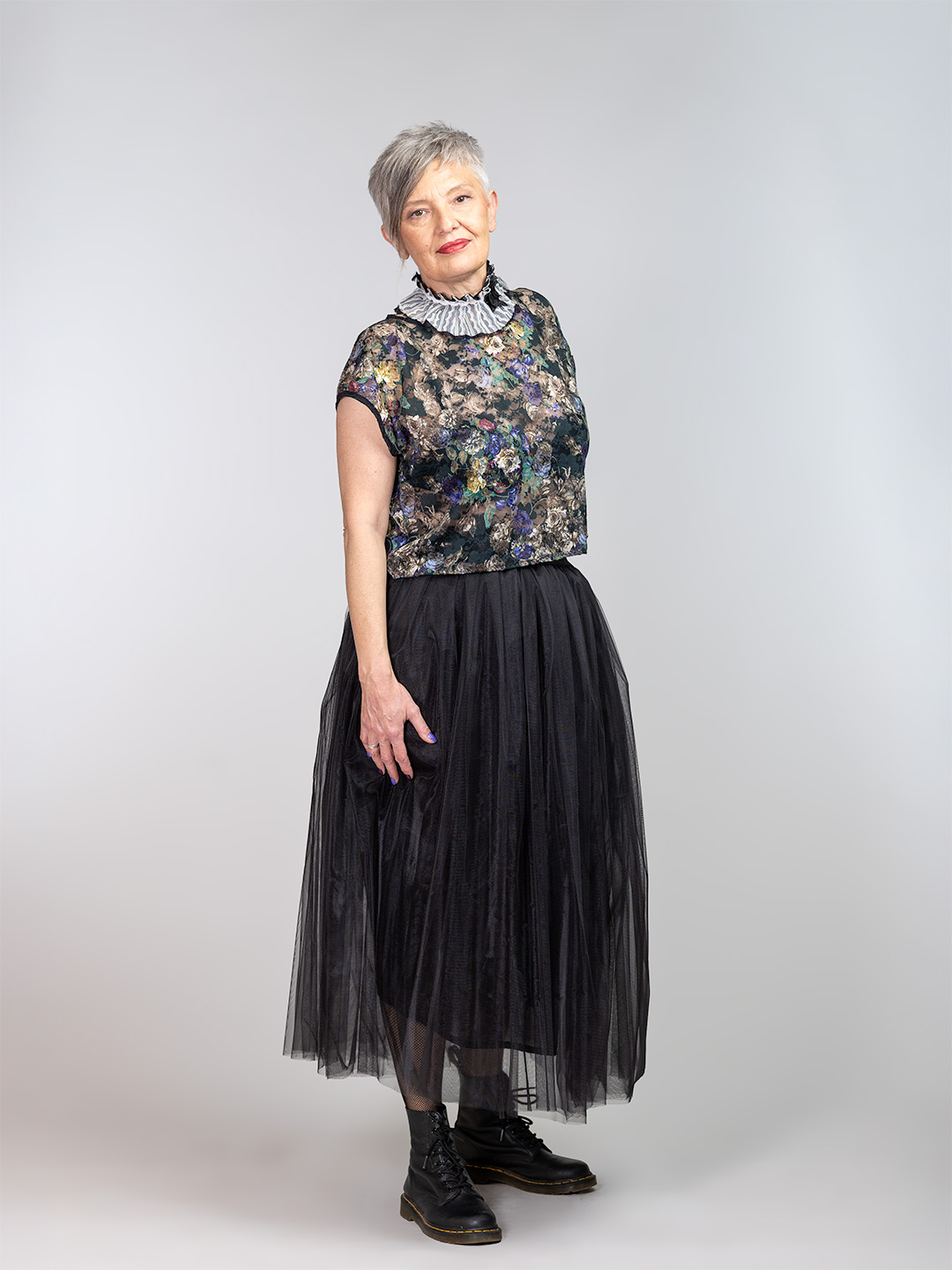 Naš “Dark Blooms” top od čipke spaja delikatnu teksturu s buntovnim duhom. S upečatljivim cvjetovima koji nisu “slatki”, već mistični i bogati, ovaj top priziva estetiku viktorijanskog doba. Cvjetni uzorak u dubokim, zagasitim tonovima ljubičaste, plave i zlatne na crnoj podlozi daje mu dubinu i onaj savršeni “vintage find” osjećaj. Ovo nije još jedan obični prozirni top – ovo je komad koji nosi cijeli outfit. Odlično ga nadopunjava naš crno-bijeli ovratnik od čipke (na slici) koji licu daje uokviren, gotovo aristokratski izgled.