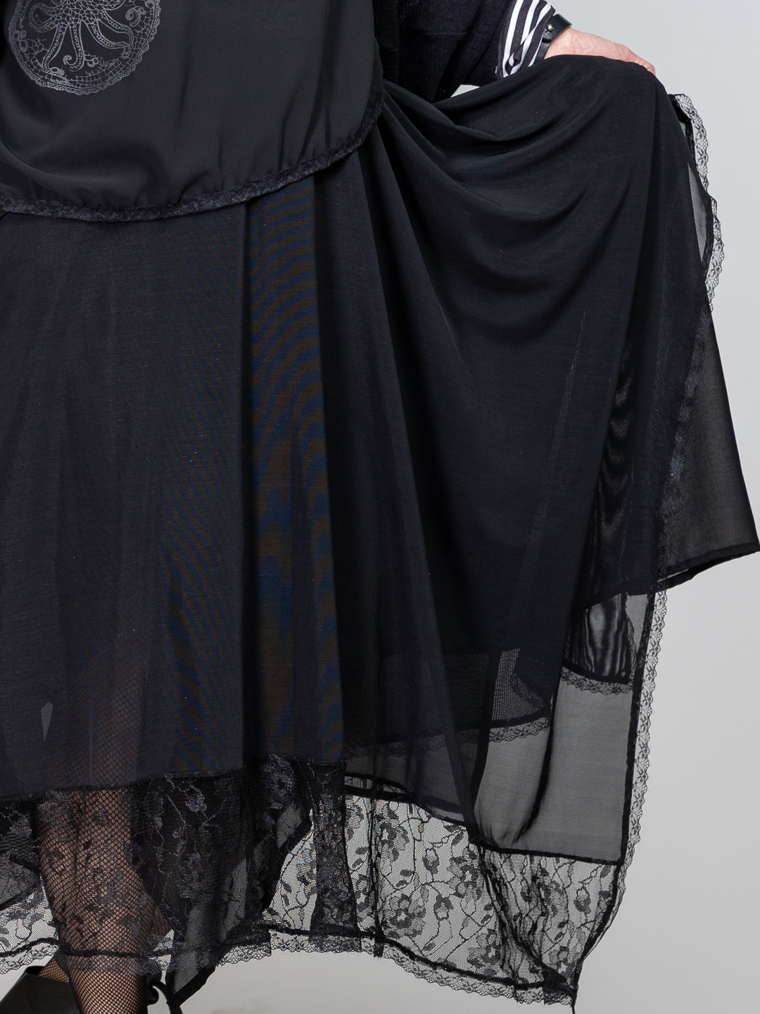 Ova crna asimetrična suknja stvorena je za one koji se ne boje istaknuti. Spoj ležernosti i alternativne estetike čini je savršenim komadom za slojevite outfite koji privlače poglede. Slojevi različitih duljina daju ti nevjerojatnu slobodu pokreta i onaj „wow” efekt dok hodaš. Kombinacija laganog materijala i bogatih detalja od čipke dodaje dubinu cijelom looku. Lagana, prozračna i idealna za cjelodnevno nošenje – od kave u gradu do večernjeg koncerta. Zahvaljujući specifičnom dizajnu, lako se uklapa u gothic, boho ili moderni avangardni stil. Ako tražiš nešto što nije „već viđeno”, tvoja potraga završava ovdje.
