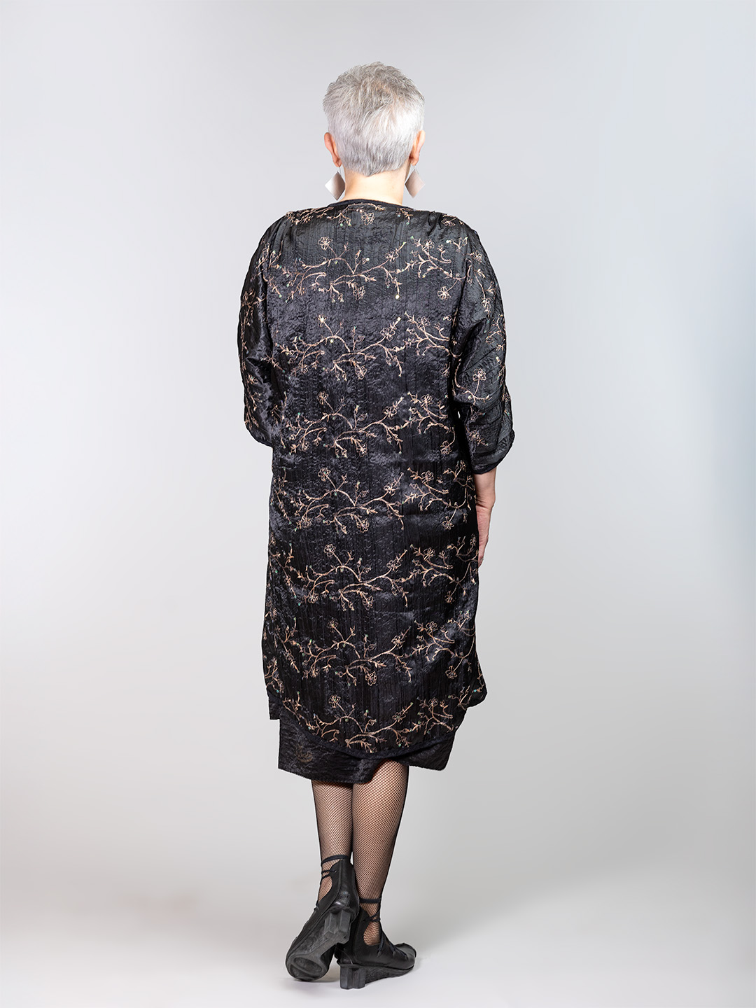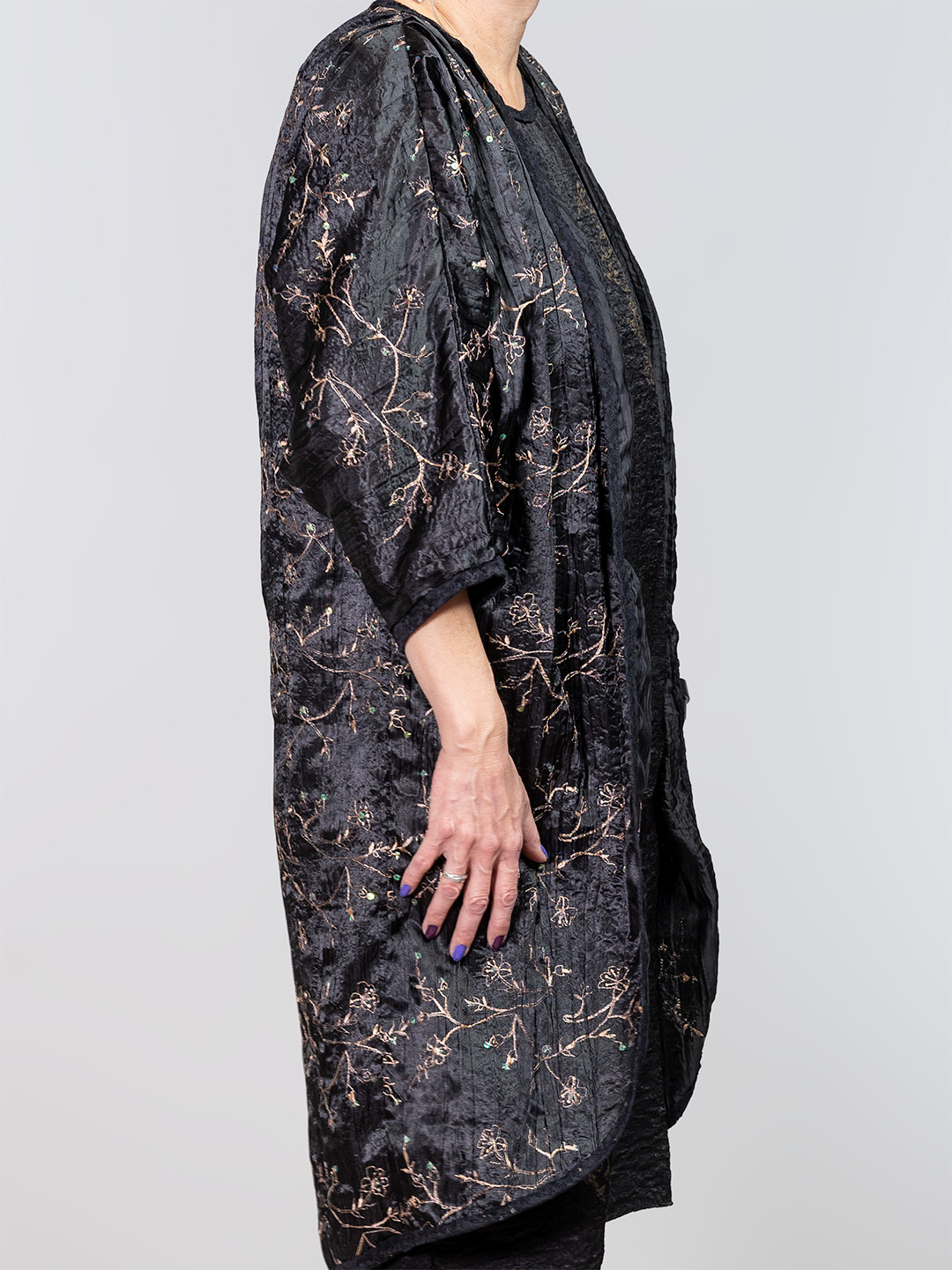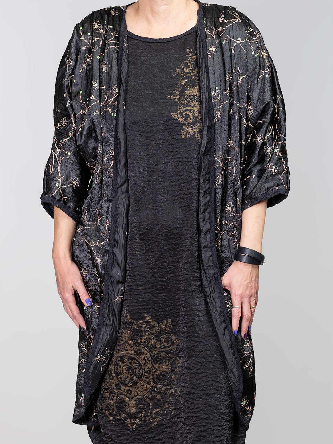 Ovaj crni kimono izrađen je od luksuzno naborane satenske tkanine izvezene zlatnim vezom. Jednostavan kroj i fluidan pad čine ga idealnim za slojevito stiliziranje uz haljine ili jednostavne outfite kojima je potreban onaj jedan statement komad da ih učini autentičnim. Savršen izbor za ljubitelje alternativne elegancije i unikatnih modnih detalja.