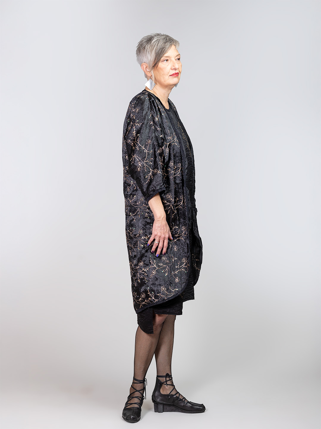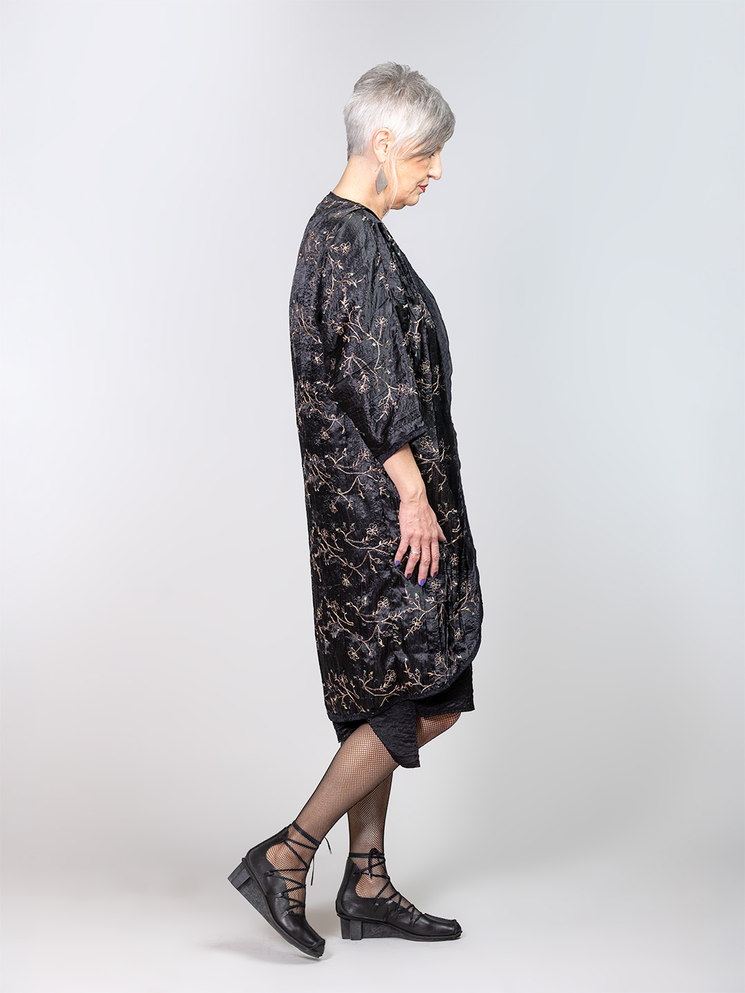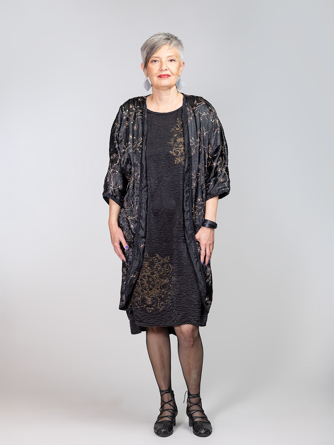 Ovaj crni kimono izrađen je od luksuzno naborane satenske tkanine izvezene zlatnim vezom. Jednostavan kroj i fluidan pad čine ga idealnim za slojevito stiliziranje uz haljine ili jednostavne outfite kojima je potreban onaj jedan statement komad da ih učini autentičnim. Savršen izbor za ljubitelje alternativne elegancije i unikatnih modnih detalja.