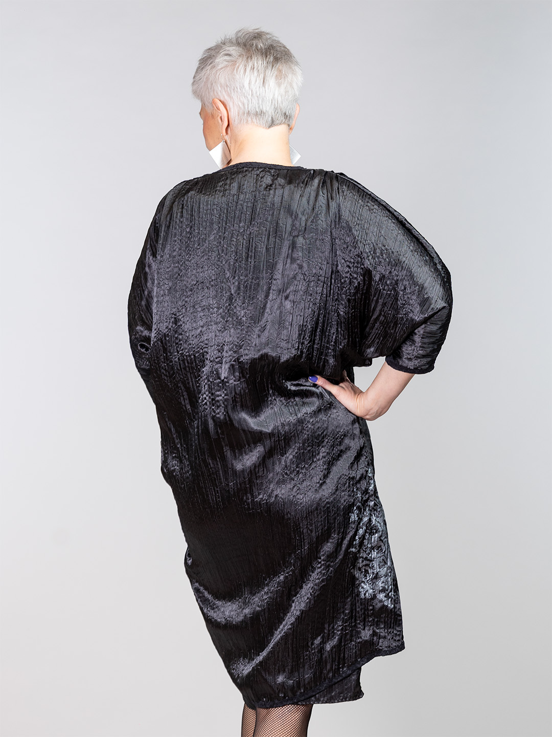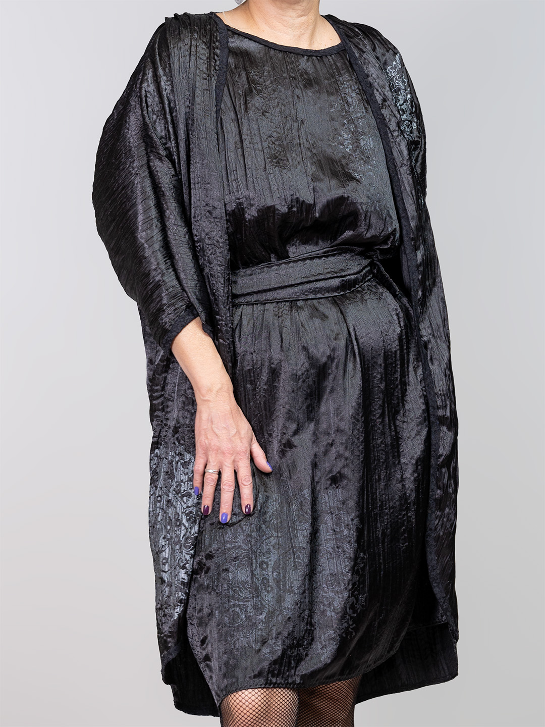 Ovaj crni kimono izrađen je od luksuzno naborane satenske tkanine s motivom srebrne čipke koji mu daje suptilan kontrast. Jednostavan kroj i fluidan pad čine ga idealnim za slojevito stiliziranje uz haljine ili jednostavne outfite kojima je potreban onaj jedan statement komad da ih učini autentičnim. Savršen izbor za ljubitelje alternativne elegancije i unikatnih modnih detalja.