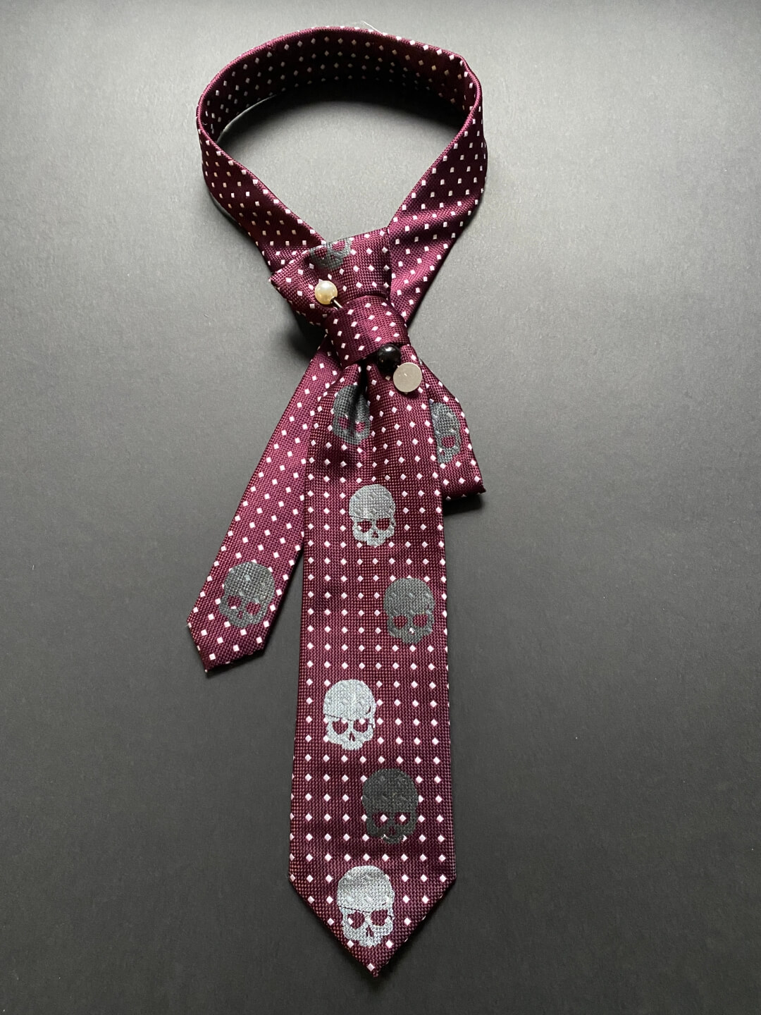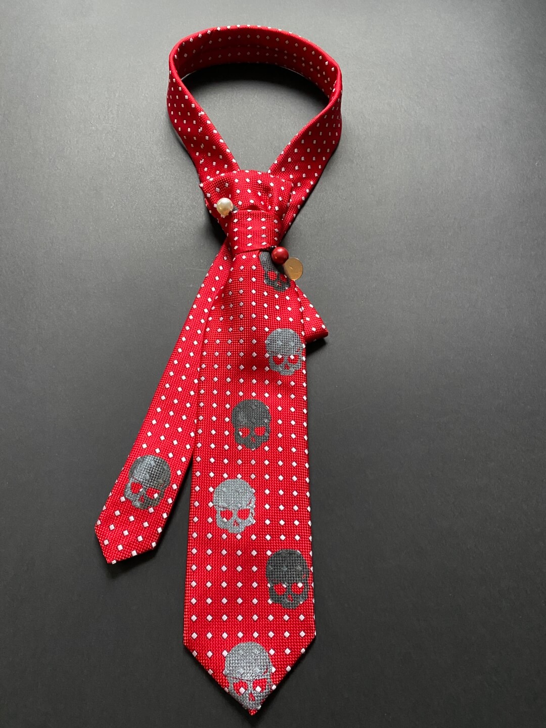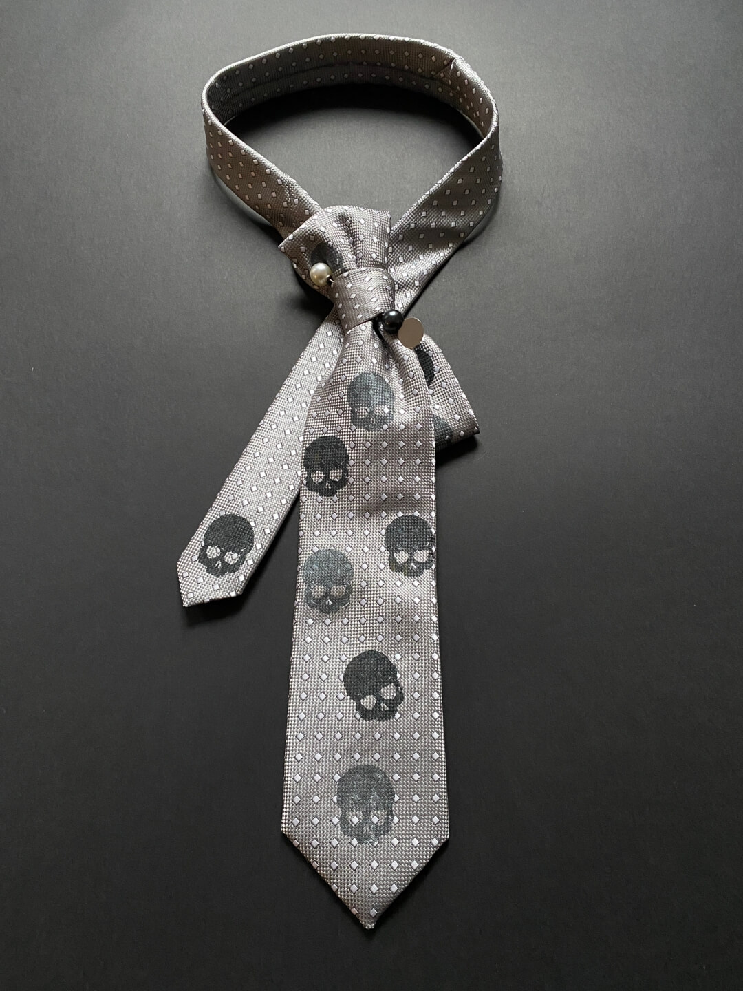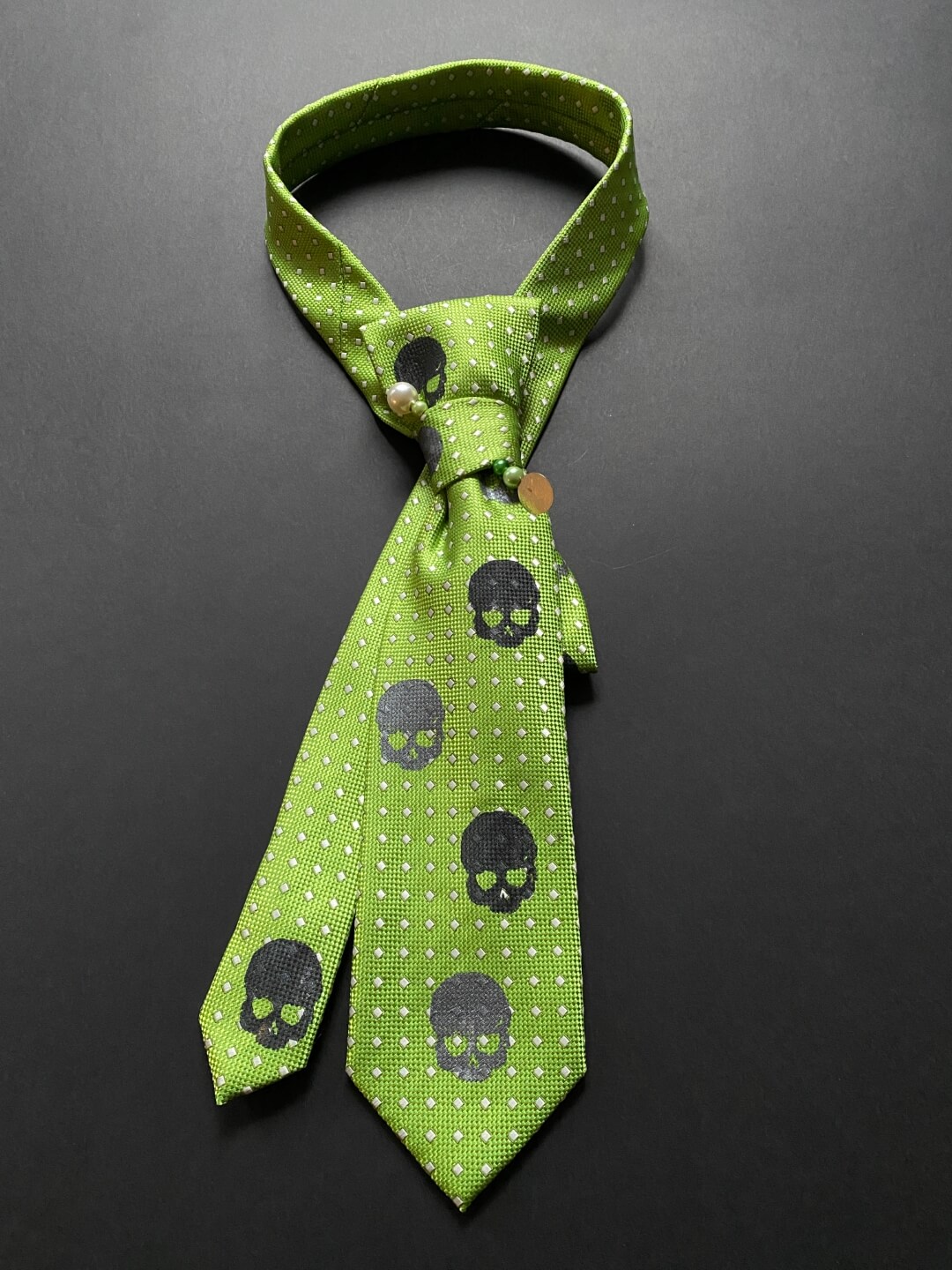 Ove kravate su pravi “game changer” za tvoj stil. Svaki komad je unikat, ručno redizajniran (upcycled) i dorađen kako bi klasičnom muškom dodatku dao potpuno novi, ženstveni identitet. Ukrašene su tiskom lubanjica u kontrastnoj boji, ali smo im dodali igle s elegantnim biserima koje im daju “ladylike”moment. Budući da su ručno zašivene i kopčaju se diskretnim drukerima, tvoj jedini zadatak je odabrati boju koja najbolje priča tvoju priču.