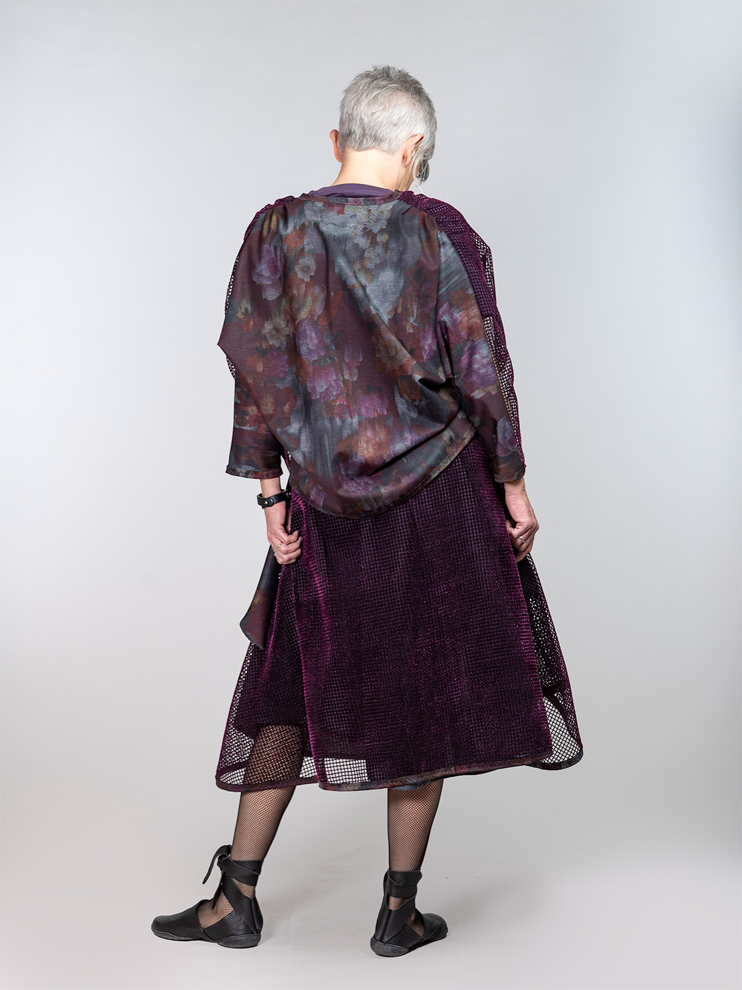 Ova mrežasta ljubičasta jaknica nije za one koji se žele stopiti s masom. Tamna, bogata nijansa ljubičaste i baršunasta mrežasta tekstura stvaraju mističan dojam s modernim, urbanim, avant-garde twistom. Savršena je za slojevito kombiniranje, idealno se uklapa uz haljine, statement suknje ili minimalistički total black look. Ova dizajnerska jakna idealna je za žene koje vole unikatnu odjeću, odvažan look i modu koja ima karakter.