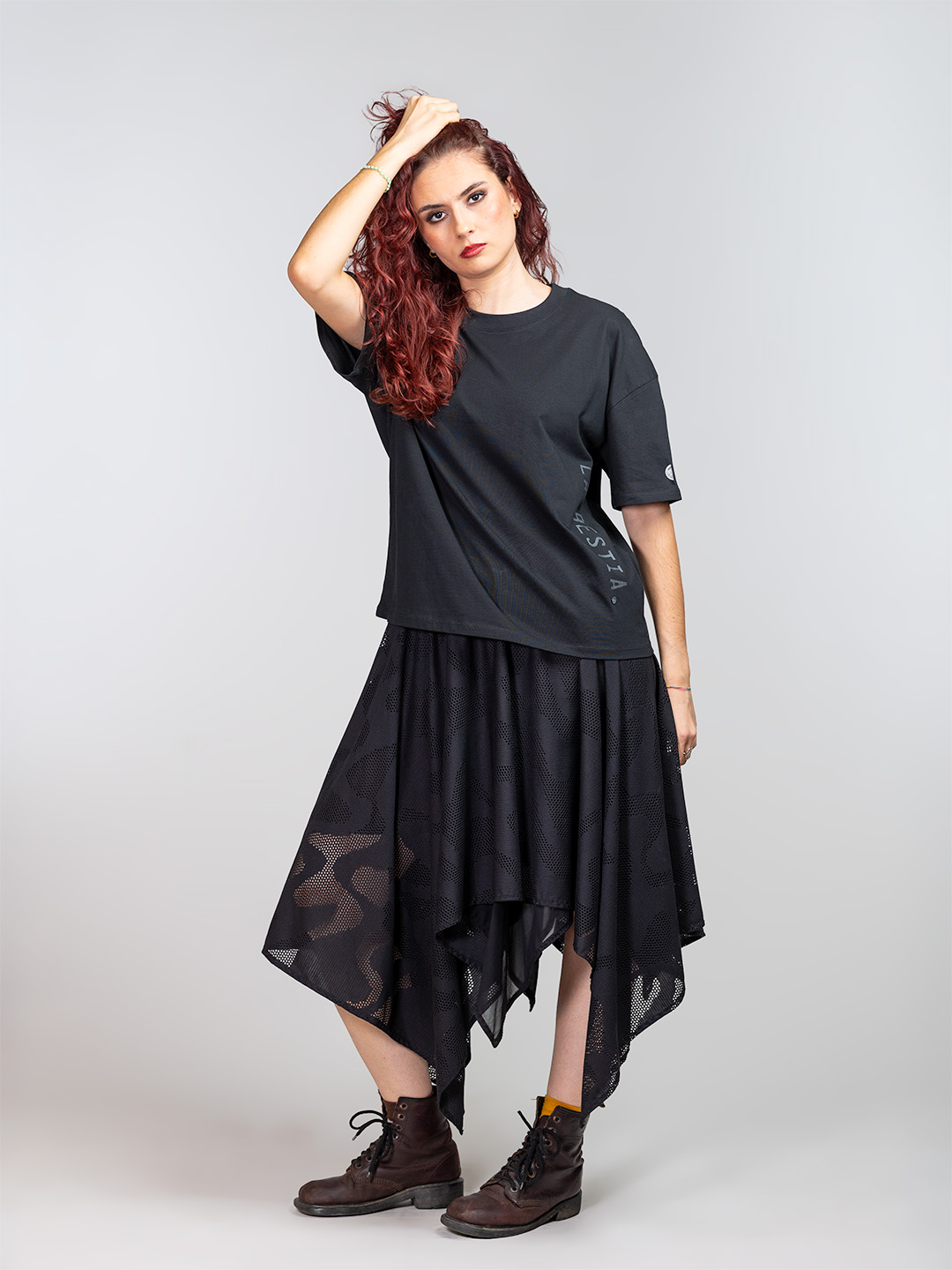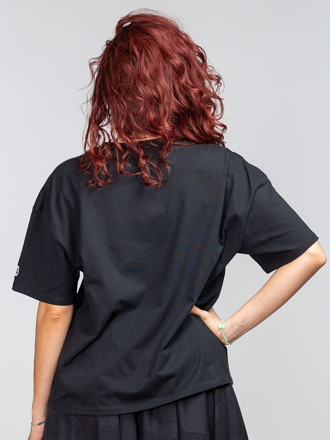 Crna oversized majica s vertikalnim srebrno-sivim natpisom "LA BESTIA" na bočnoj strani.