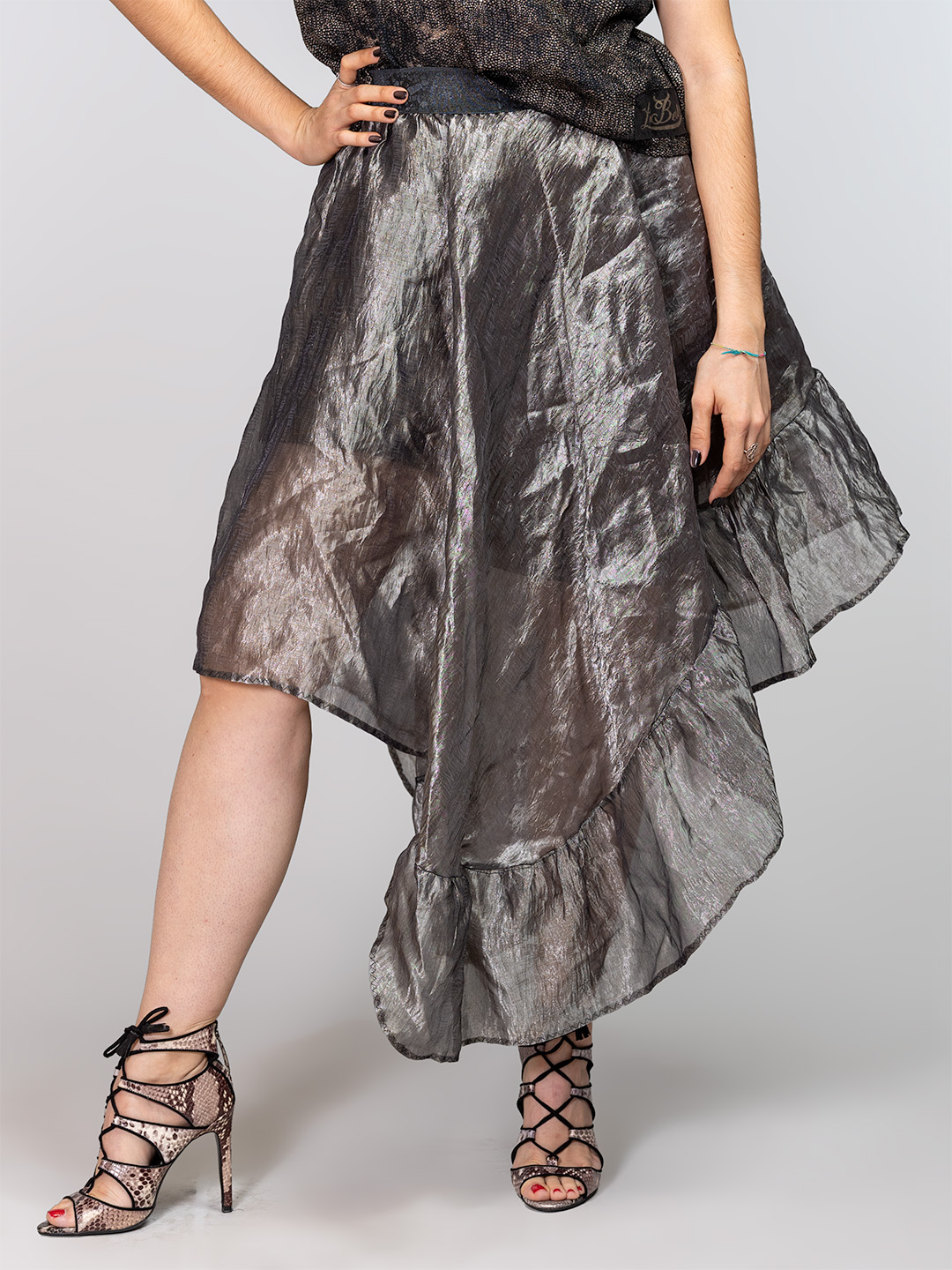 Ova srebrna suknja je definicija futurističkog šika. Materijal koji podsjeća na tekući metal i voluminozni volani čine je idealnim komadom za sve koji žele “ukrasti” svjetla reflektora bez previše truda. Ova asimetrična suknja donosi futuristički, gotovo holografski sjaj u tvoju svakodnevicu. Svila protkana metalnim nitima svojom „zgužvanom” teksturom daje joj dubinu i autentičan, pomalo sirov izgled, a lagana prozirnost unosi dozu eteričnosti.