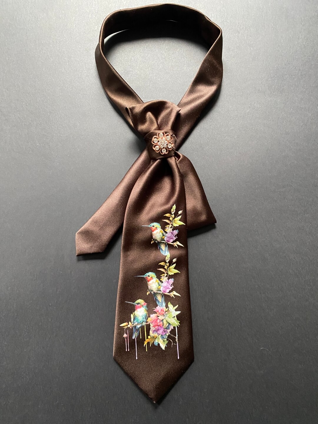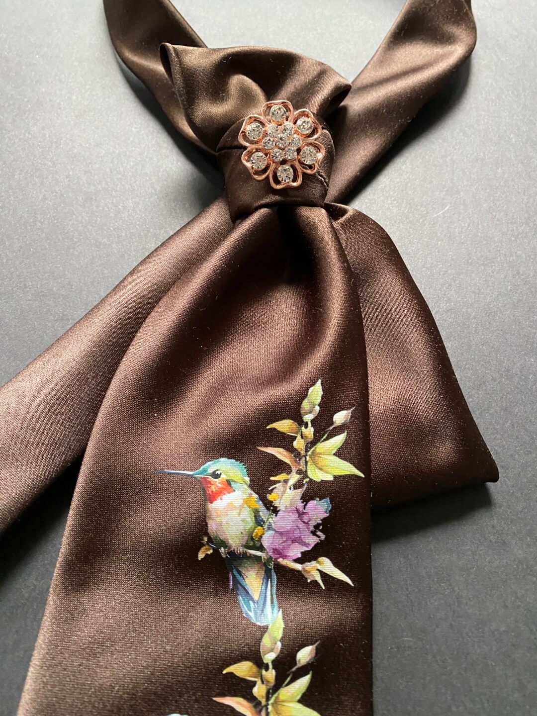 Redizajnirana smeđa kravata s printom kolibrića i brošem
