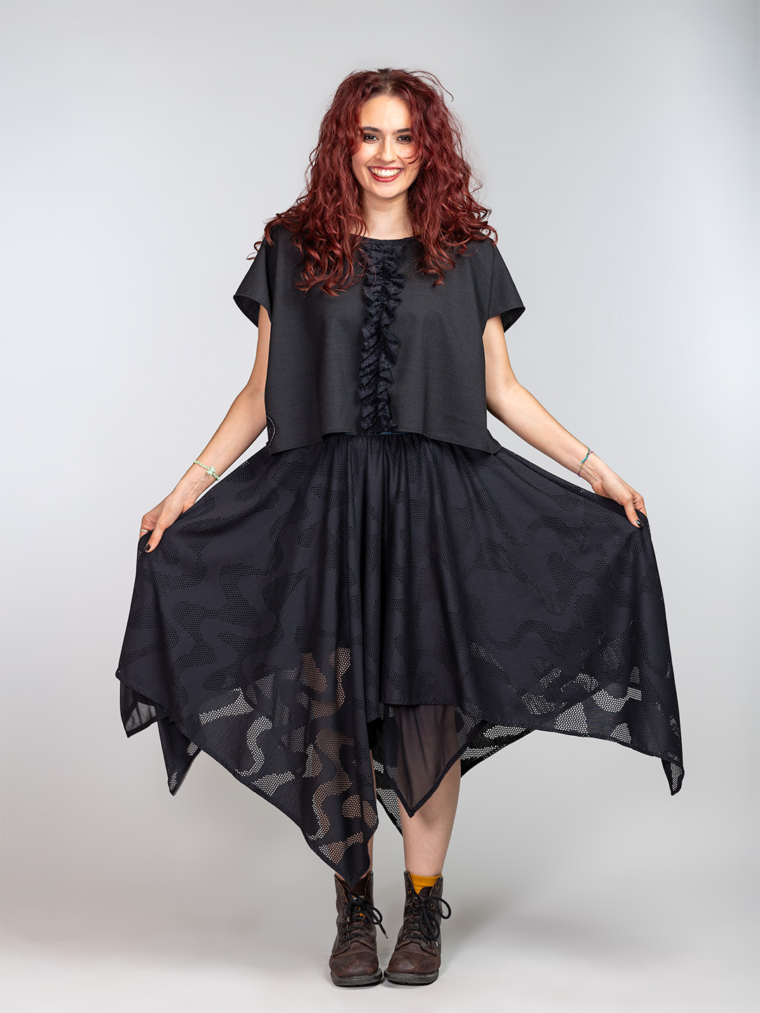 Top Shadow je izrađen od kvalitetnog, laganog materijala u tamno sivoj boji, s naglašenim volanom od crne čipke koji se proteže po sredini prednjeg dijela, dodajući dozu sofisticiranosti i razigranosti. Ravni, široki kroj pruža udobnost i slobodu pokreta i odgovara svim veličinama. Savršen je za kombiniranje sa La Bestia suknjama visokog struka ili slojevitim outfitima.