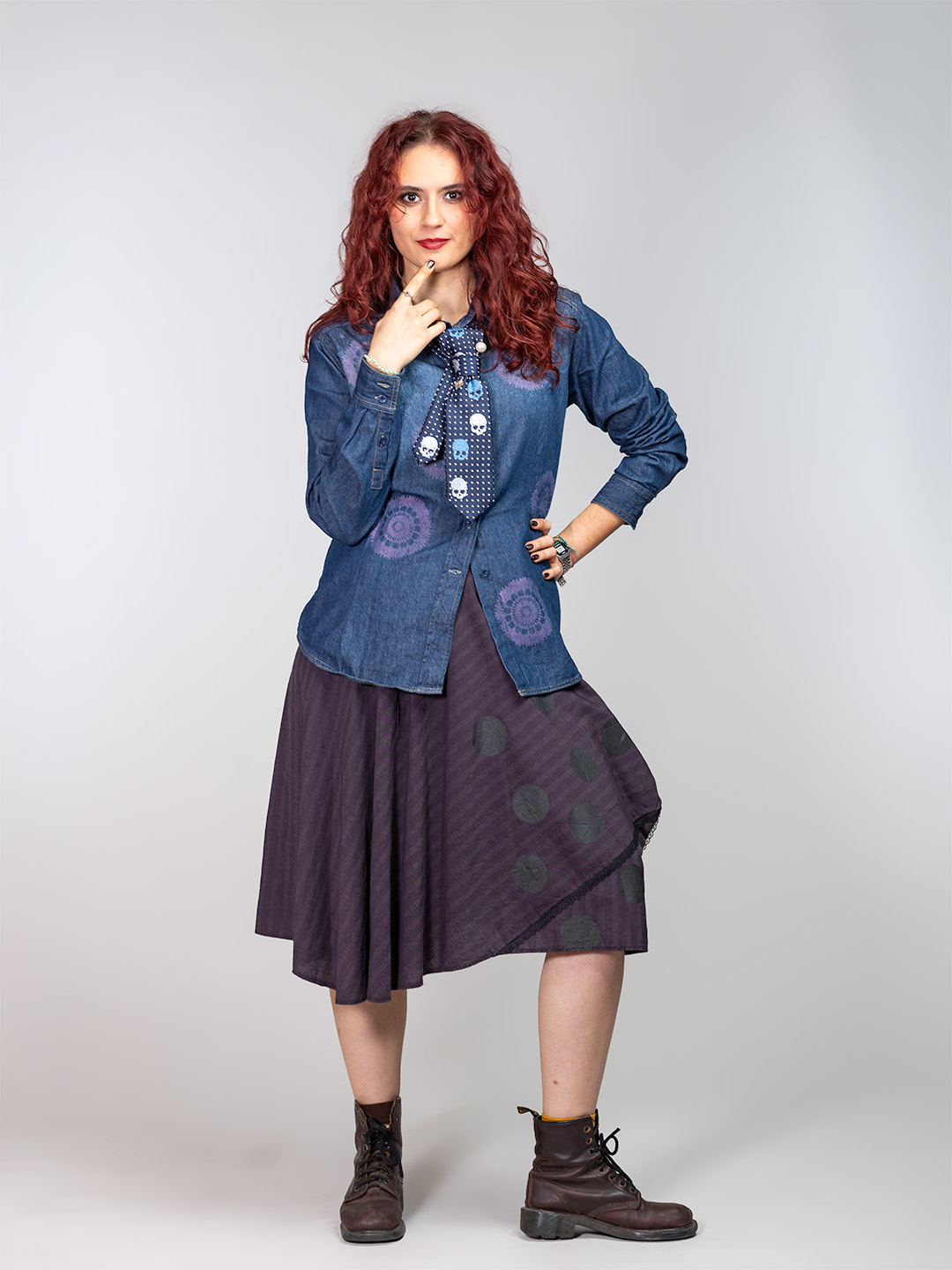 Strukirana traper košulja od kvalitetnog, tamnog denim materijala savršen je izbor za svakodnevne kombinacije. Ova jeans košulja ukrašena je originalnim motivima čipke u ljubičastoj boji otisnutima tehnikom sitotiska, što joj daje poseban i autentičan karakter. Lako se kombinira s hlačama, suknjama ili slojevito preko majice za opušten, urban look. Za sve koji vole originalan stil, uz dodatak La Bestia kravate, uklopit će se i u poslovne kombinacije.