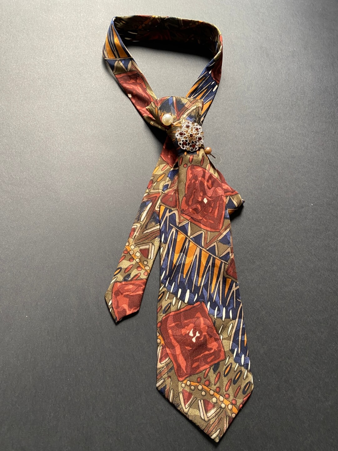Unikatna ženska kravata smeđe-zelenih tonova i apstraktnog uzorka s brošem i iglom