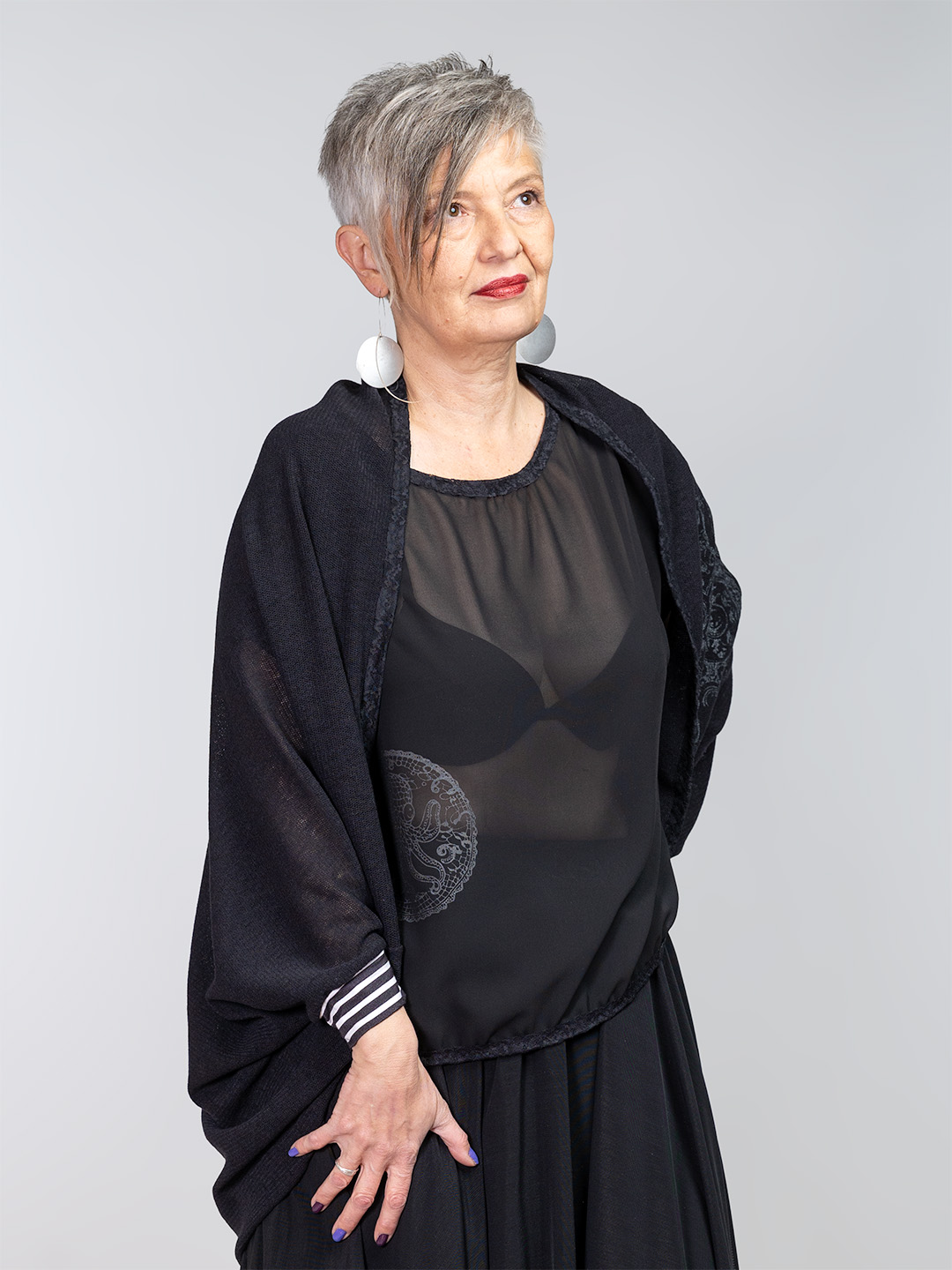 Crna ženska vesta izrađena od laganog pletiva s tiskom srebrne čipke i crna asimetrična suknja