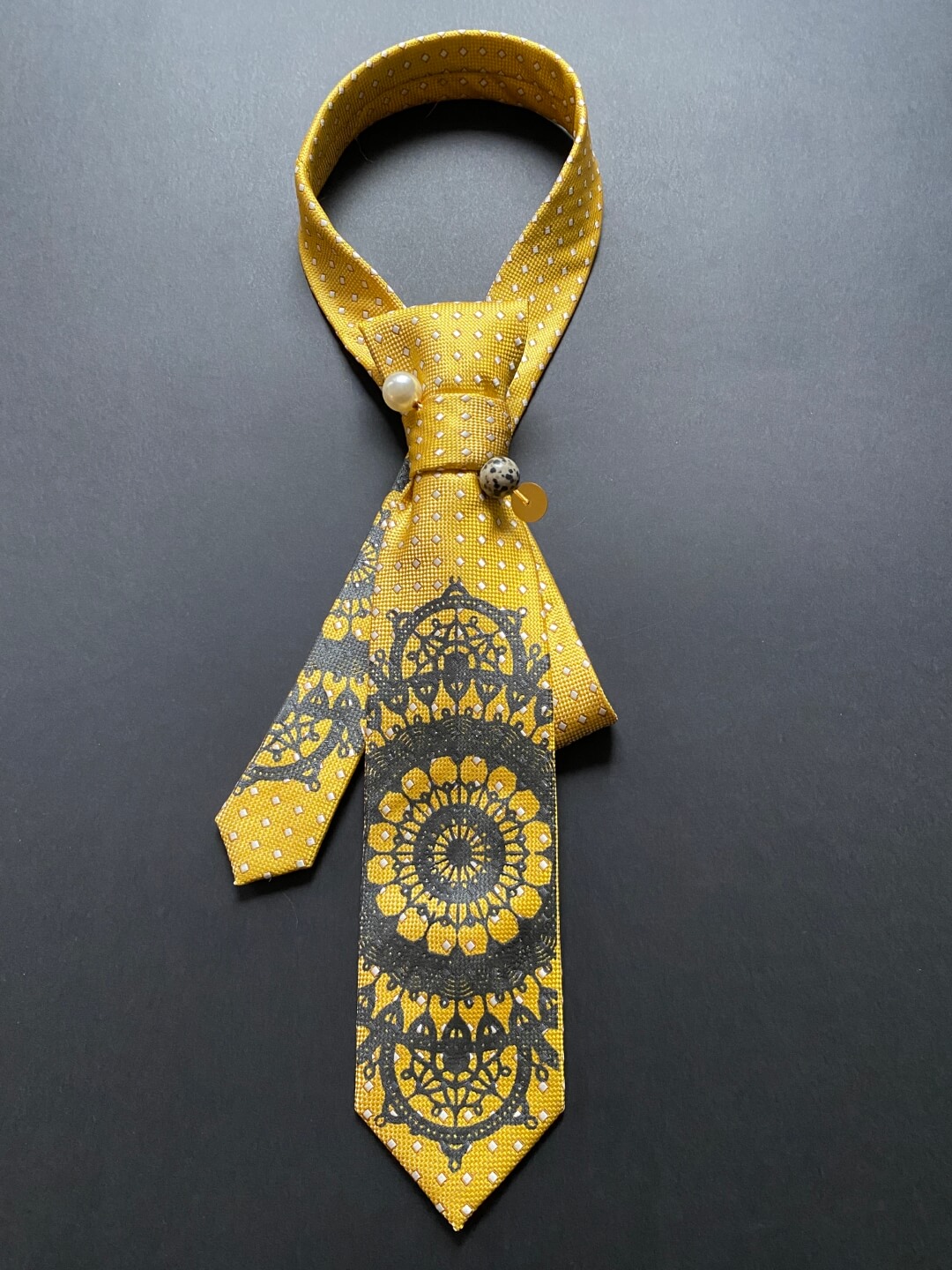 Naše ženske kravate su pravi “game changer” za tvoj stil. Spoj su retro šarma i modernog dizajna. Svaka kravata je unikat, ručno redizajniran (upcycled) i dorađen kako bi klasičnom muškom dodatku dao potpuno novi, ženstveni identitet. Ukrašene su bogatim printom čipke u kontrastnoj boji i elegantnim broševima ili iglama s biserima koji im daju “ladylike” moment. Budući da su ručno zašivene i kopčaju se diskretnim drukerima, tvoj jedini zadatak je odabrati onu koja najbolje priča tvoju priču.